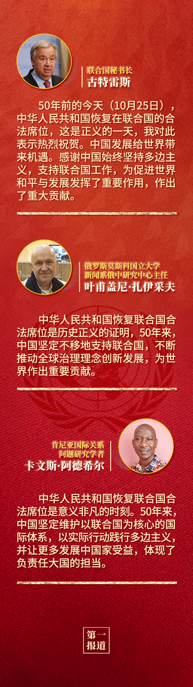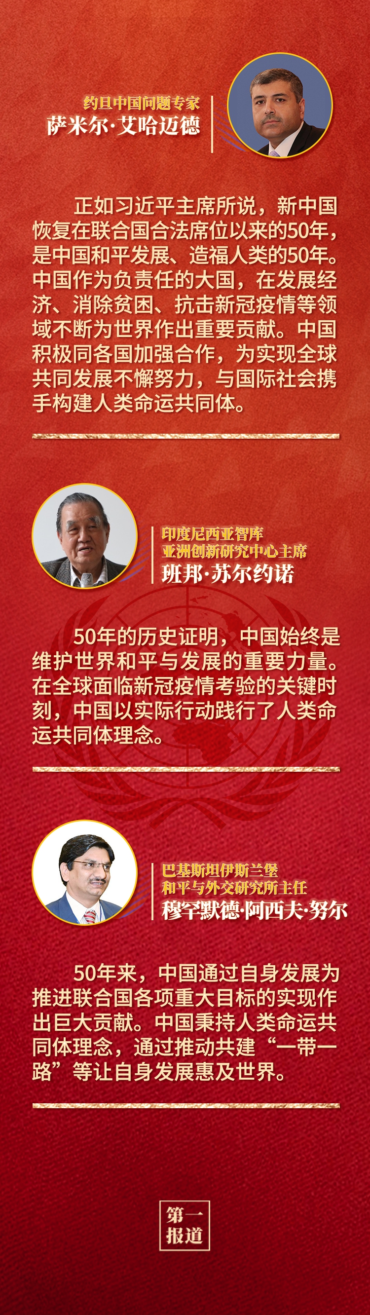 多國人士認為,中華人民共和國恢復聯合國合法席位是世界和聯合國歷史上的一個大事件,習近平主席的重要講話回顧了中國和平發展、造福人類的50年,為實現世界永續和平發展提出重要倡議,為全球共同推動構建人類命運共同體注入新的強大動力。