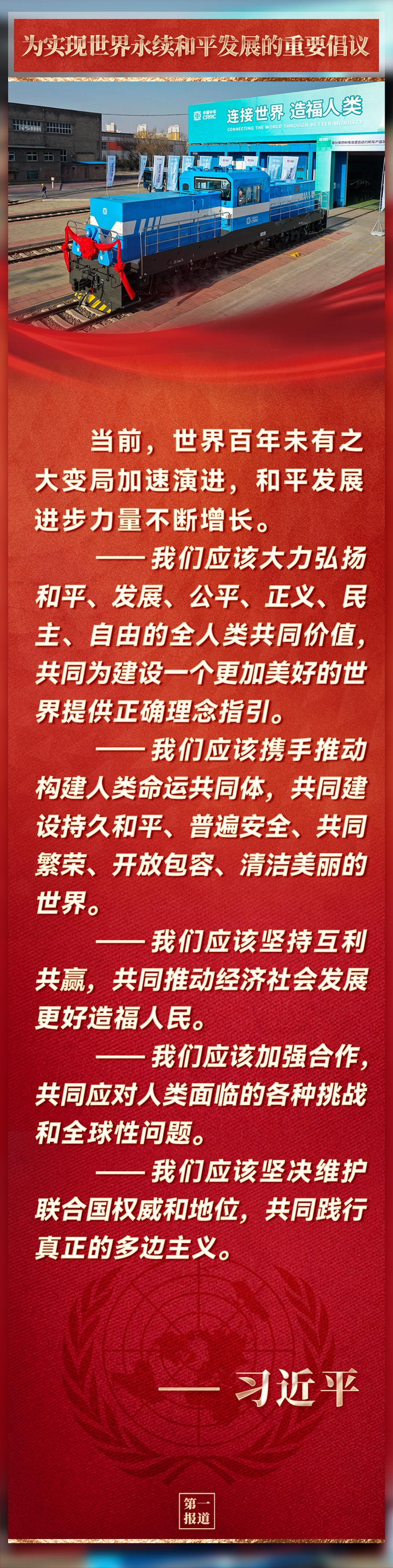 在中華人民共和國恢復聯合國合法席位50周年紀念會議上,習近平主席提出重要倡議。國際社會看到,中國智慧和中國方案再次為實現世界永續和平發展注入動力。