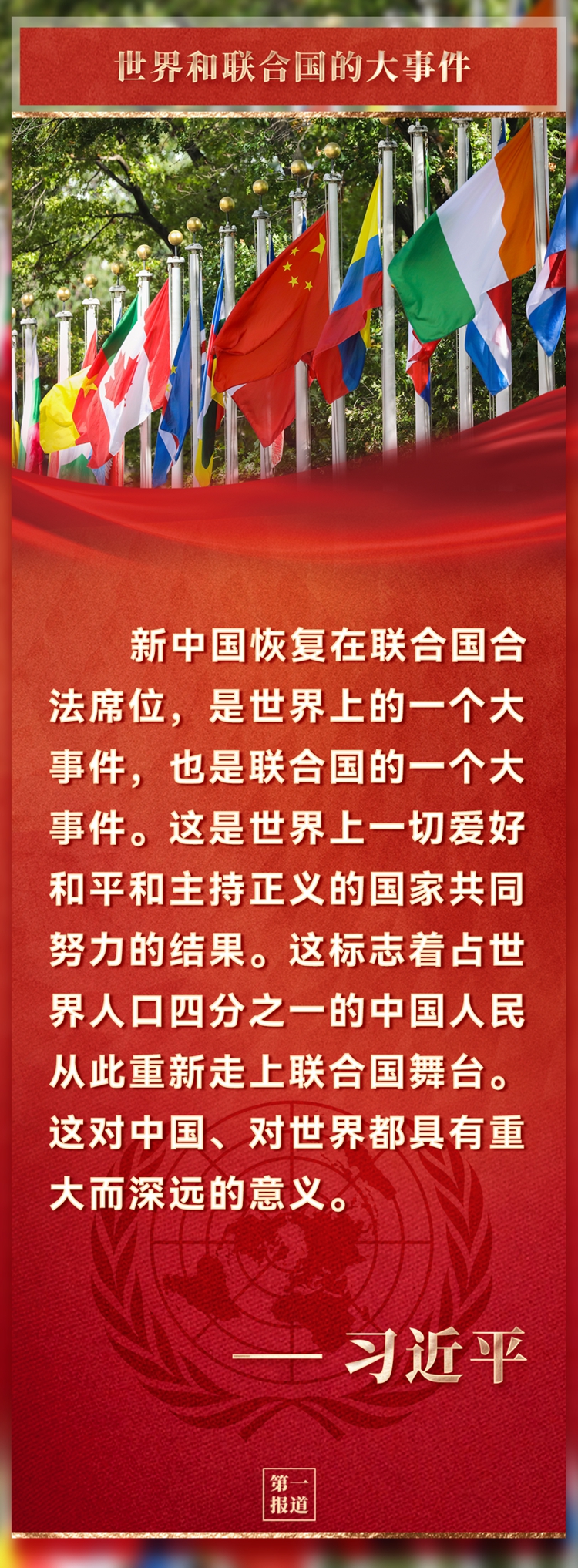1971年10月25日,第二十六屆聯合國大會以壓倒性多數通過第2758號決議,決定恢復中華人民共和國在聯合國的一切權利,承認中華人民共和國政府代表是中國在聯合國的唯一合法代表。這是中國人民的勝利,也是世界各國人民的勝利。這是世界公道正義的勝利,也是聯合國憲章宗旨和原則的勝利。自此,占世界人口近四分之一的中國人民在聯合國有了真正代表。聯合國的普遍性、代表性和權威性得到切實增強,世界和平與發展的力量得到空前壯大。