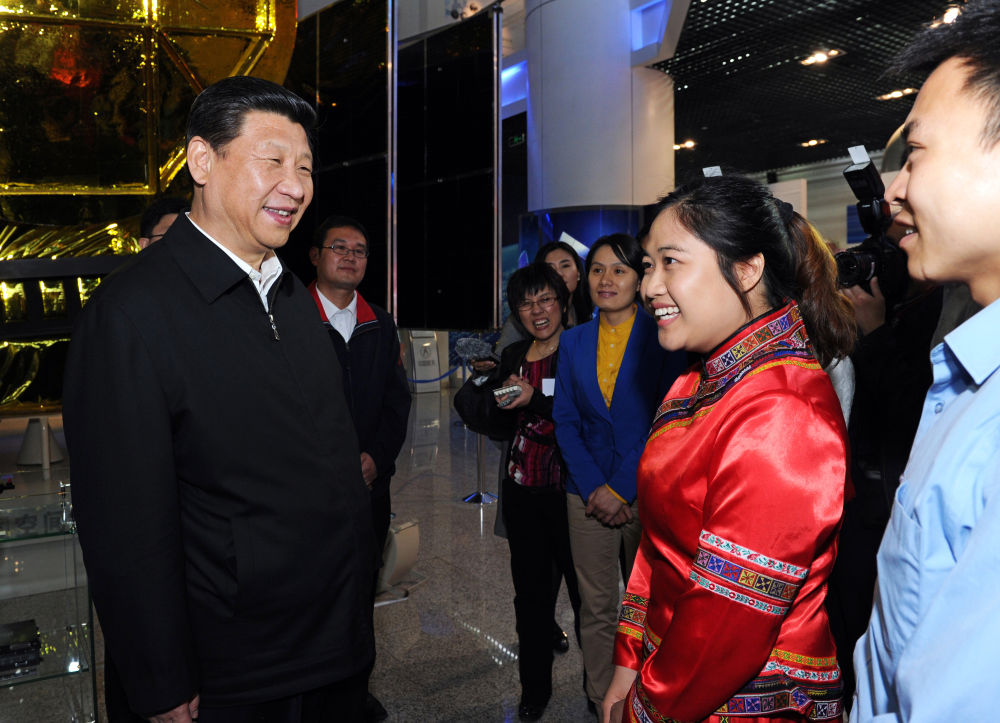 2013年5月4日,習近平來到中國航天科技集團公司中國空間技術研究院,同各界優秀青年代表座談并發表重要講話。這是座談會前,習近平和在展廳參觀的優秀青年代表交談。
