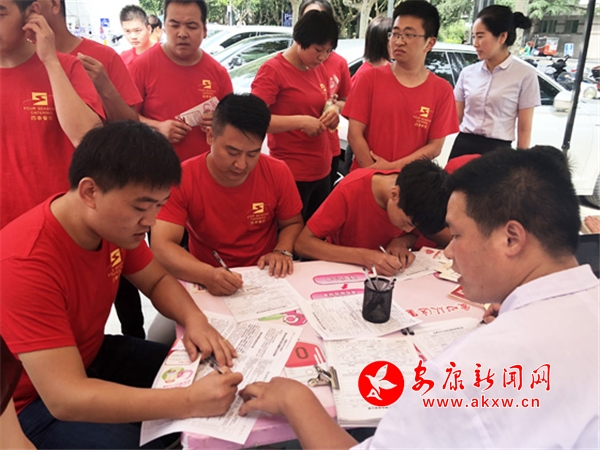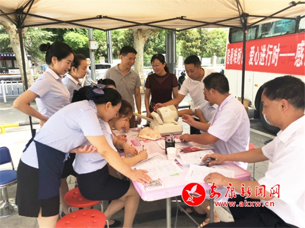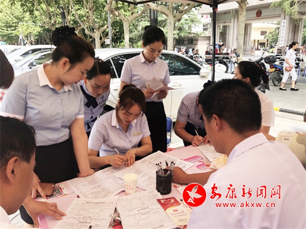 早晨的空氣格外清新,前夜的大雨帶走了不少暑氣,給了悶熱的夏日送來一絲難得的清涼。8點不到,安康市中心血站的獻血車已?吭谒募静惋嫲部蒂e館門前,等待著獻血者的到來。上午九點半,結束了例會的員工們陸續來到車前,大家圍坐在一起體檢、填表,市中心血站副站長詹勝萍,獻血服務科科長潘登也來到活動現場,與工作人員一同做起動員工作,詹副站長親切耐心地為獻血者講解血液常識,發放宣傳彩頁,叮囑獻血注意事項,活動現場的氣氛十分活躍。