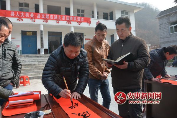 1月19日,白河縣人大、縣文聯組織縣內十名書法家走進西營鎮土泉村,為精準扶貧村民現場書寫春聯,送去新春祝福。