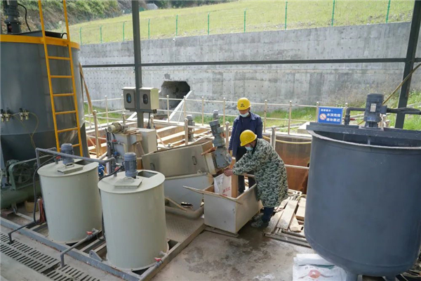 ↑4月9日,工作人員在白河縣里端溝(二期)重金屬污染綜合整治工程項目污水處理站內清淤。