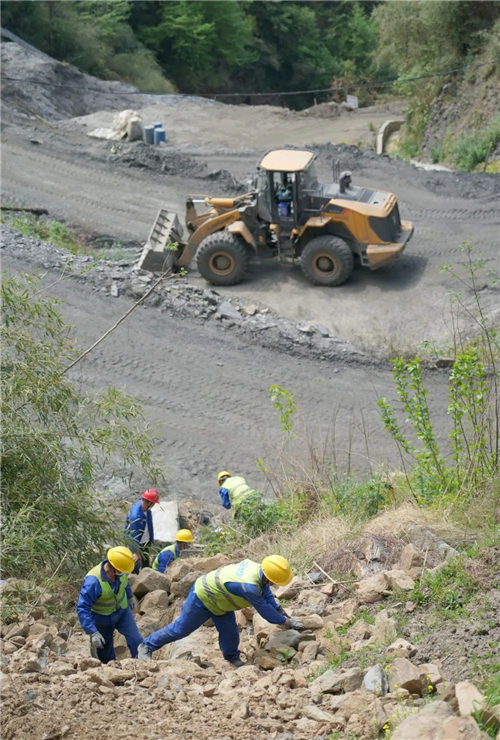 ↑4月9日,在白河縣卡子鎮鳳凰村一處廢棄硫鐵礦污染治理施工現場,工人在清理排洪渠。