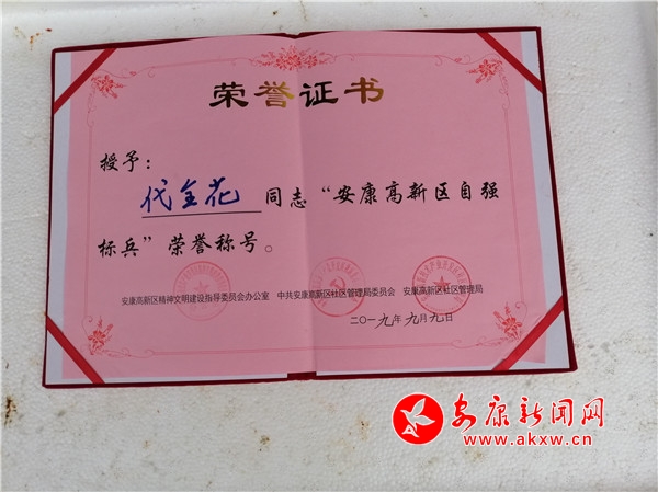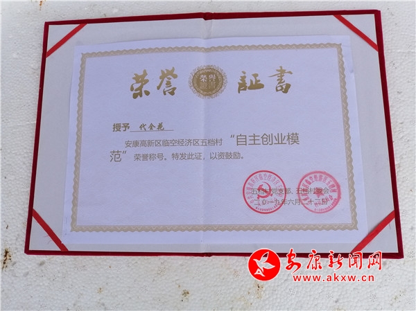 筆者從陳斌口中得知,2019年6月,代全花分別被安康高新區(qū)和五檔村黨支部、村委會(huì)授予“自強(qiáng)標(biāo)兵”和“自主創(chuàng)業(yè)模范”榮譽(yù)稱(chēng)號(hào),去年一家成功實(shí)現(xiàn)了脫貧。