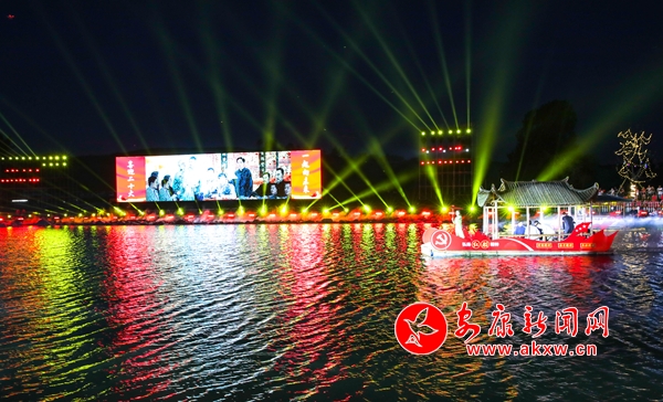 晚會(huì)在嘹亮激昂的獨(dú)唱《東方紅》中拉開(kāi)序幕,緊接著,磅礴大氣的歌舞串燒《我和我的祖國(guó)》《萬(wàn)疆》《愛(ài)我中華》,如詩(shī)如畫(huà)的水上表演《南湖紅船》《江南水鄉(xiāng)》《滾滾長(zhǎng)江東逝水》,動(dòng)力澎湃的RAP時(shí)尚秀《門(mén)戶新安康》,美輪美奐歌舞表演《我的深情為你守候》《為祖國(guó)干杯》《送你一個(gè)長(zhǎng)安》《我愛(ài)你,中國(guó)》《領(lǐng)航》等節(jié)目相繼登臺(tái)表演,與此同時(shí),絢麗多彩的燈光秀和仙氣飄飄的霧森特效穿插其中,不斷將演出推向高潮。最后,整場(chǎng)演出在大合唱《沒(méi)有共產(chǎn)黨就沒(méi)有新中國(guó)》的歌聲中圓滿落下帷幕。