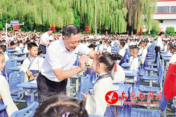 為傳承中國(guó)傳統(tǒng)文化,進(jìn)一步加強(qiáng)學(xué)生文明禮儀教育,日前,安康高新區(qū)第一小學(xué)舉行一年級(jí)新生開(kāi)筆禮及優(yōu)秀學(xué)生表彰活動(dòng)。千名一年級(jí)蒙童身著漢服,由班主任帶領(lǐng)跨過(guò)啟蒙門(mén),正衣冠、感恩鞠躬、朱砂啟智、擊鼓明志、開(kāi)筆啟蒙,接受中國(guó)傳統(tǒng)文化的洗禮,領(lǐng)略傳統(tǒng)文化的魅力。(張凌云 攝)26y安康新聞網(wǎng)