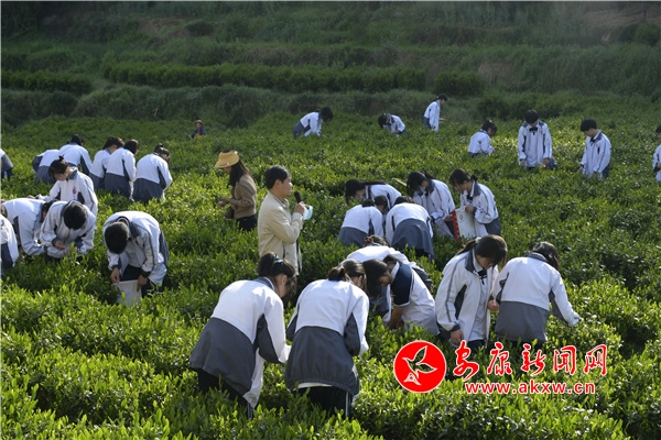 在采茶、沏茶實(shí)踐現(xiàn)場,同學(xué)們毫不掩飾心中的喜悅,三個(gè)一組、五個(gè)一群,精心挑選,“茶海”間到處可見學(xué)生忙碌的采茶身影。在一片片綠意之間,隨行地理老師們精彩的農(nóng)業(yè)知識(shí)講解,同學(xué)們了解了認(rèn)茶、采茶、炒茶等茶藝知識(shí),收獲了傳統(tǒng)農(nóng)業(yè)知識(shí),領(lǐng)略了茶文化的禮儀美德,感受到了勞動(dòng)意義和價(jià)值。