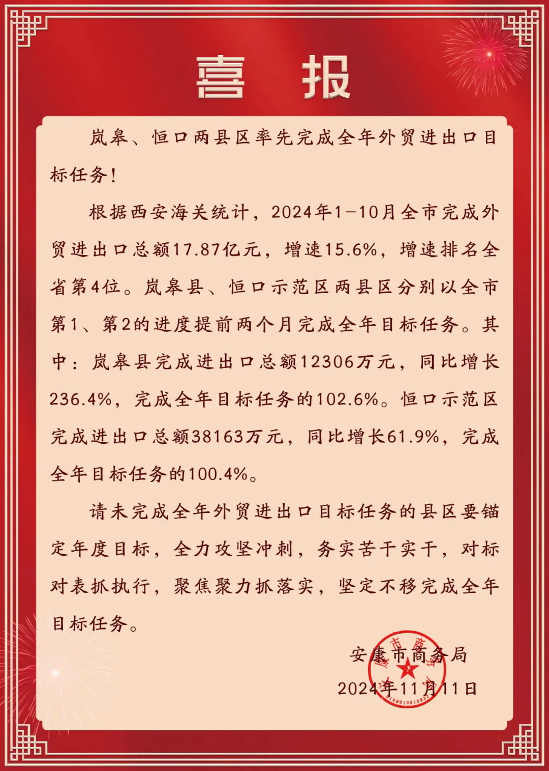 近日,市商務局發來喜報,恒口示范區率先完成全年外貿進出口目標任務。
