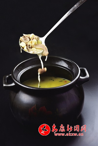 豬肚蓮子養生湯:將新鮮豬肚清洗焯水,蓮子取芯,加輔料用大火熬制成湯。豬肚為豬科動物豬的胃,味甘,性溫,歸脾、胃經;蓮子為睡蓮科植物蓮的干燥成熟種子,味甘、澀,性平,歸脾、腎、心經。豬肚蓮子湯自古以來就是一道食補菜,具有補脾止瀉、益腎澀精、養心安神的功效。