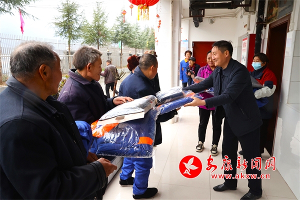 縣民政局局長柯玉俠向老人發放換季衣物。3NW安康新聞網