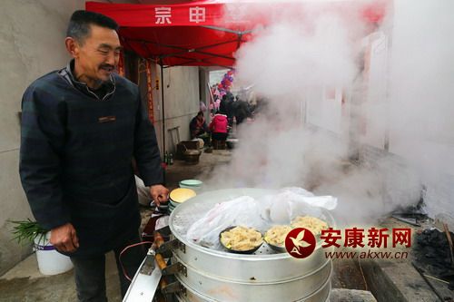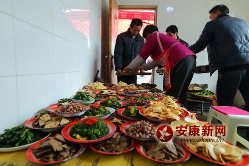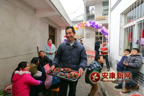 這時,新郎家是最熱鬧的,為了辦好婚禮,附近的親朋好友一一前來幫忙和捧人氣。新郎的家里搭起了氣球彩門,紅紅的對聯和喜字分別貼在窗戶和門上,院壩里架起了大蒸籠,八大碗早就上了籠,涼菜在案板上整整齊齊的一溜溜擺著。花生、瓜子、糖果一一擺在屋子里、院壩里的十來張大圓桌上。按照墻上貼著的執事單的安排,廚房、客廳、禮房等每個角落的人都在干著自己的事情。寒冬里的婚禮,沒有人喊累,嚴寒在這一刻被驅散。