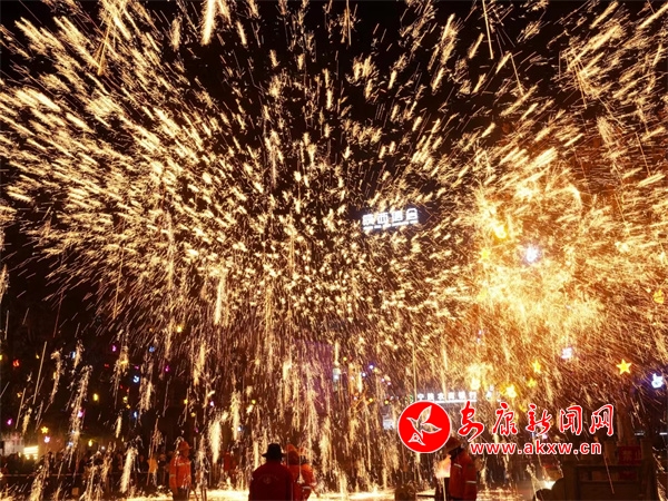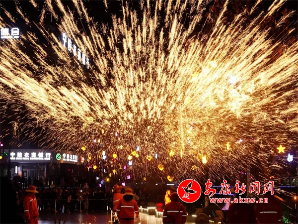 19:30,在寧陜縣中心廣場,伴隨著鏗鏘有力的鑼鼓聲,寧陜縣傳統(tǒng)文化活動表演開始。舞獅、陜南花鼓、民間小調(diào)等傳統(tǒng)民俗節(jié)目輪番上演,為現(xiàn)場群眾送去了豐富的民俗文化大餐。而在傳統(tǒng)文化表演中,最吸引人的是打鐵花,只見表演者將提前加熱好的鐵水猛力擊打,絢爛的鐵花在空中綻放,放眼望去,一串串耀眼的鐵花在空中散開,猶如煙花綻放,又似流星滑落,令人驚艷。