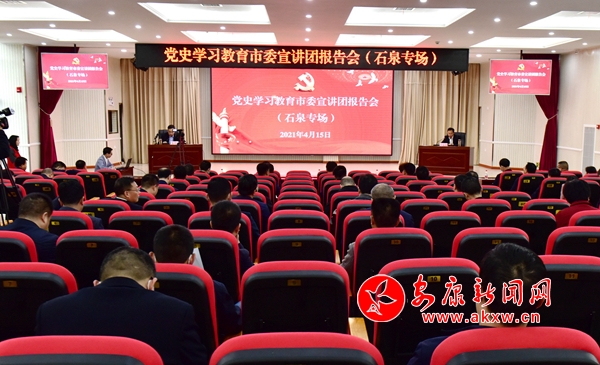本網訊(通訊員 譚文昌)4月15日下午,黨史學習教育市委宣講團報告會在石泉舉行。市委宣講團成員、市委黨史研究室主任吳世珍作宣講報告。石泉縣全體在家縣級領導,各鎮黨委書記,縣委和縣級國家機關各部門、各人民團體、駐石各單位負責人,縣委宣傳部、縣委黨校、縣委黨史學習教育領導小組辦公室全體干部和縣委宣講團全體成員參加會議。