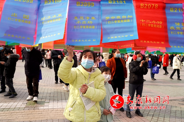 廣場(chǎng)上高高懸掛的大紅燈籠格外喜慶,兩千余條彩色布條謎語(yǔ)在陽(yáng)光下隨風(fēng)起舞。現(xiàn)場(chǎng)吸引眾多市民熱情參與,大家嚴(yán)格按照疫情防控相關(guān)規(guī)定,有序排隊(duì)領(lǐng)取謎票競(jìng)猜,再根據(jù)謎題上的序號(hào)分組排隊(duì)兌獎(jiǎng),廣播里不時(shí)傳來(lái)中獎(jiǎng)通報(bào),人們臉上都洋溢著快樂(lè)的笑容。
