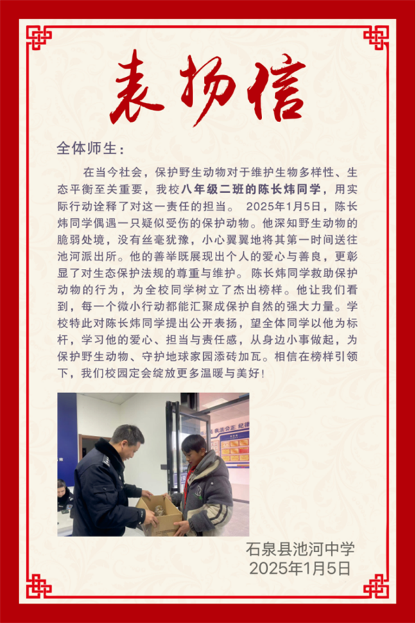 陳長煒的暖心事跡傳到學校后,學校發布了表揚信,公開表揚陳長煒同學的愛心善舉和保護野生動物的暖心行為。號召全體學生要學習陳長煒的愛心、責任和擔當,從小事做起,從自身做起,保護野生動植物,為保護地球家園、尊重生態文明的多樣性貢獻力量。