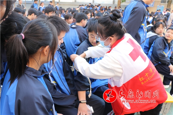 活動中,縣紅十字會工作人員向學生發放了三角巾,現場向學生講解了三角巾的結構和各部分的功能,并以手臂、肩部和胸部三個部位受傷為例做了操作示范,手把手地指導學生如何包扎、如何敷料、如何固定、如何打結。同學們邊觀察邊實操,不時和工作人員進行互動,尋求專業指導,親手體驗三角巾包扎的操作流程,在鍛煉動手實踐能力的同時,掌握身體受傷的應急處理技能,增強應對突發事件的自護自救和科學救護能力。