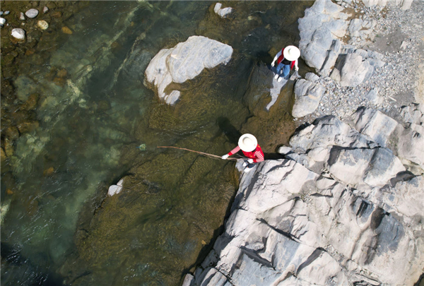 4月10日,在陜西旬陽(yáng)市雙河鎮(zhèn)高坪社區(qū)河邊,女子志愿護(hù)河隊(duì)隊(duì)員打撈水中的垃圾(無(wú)人機(jī)照片)。 新華社記者 邵瑞 攝