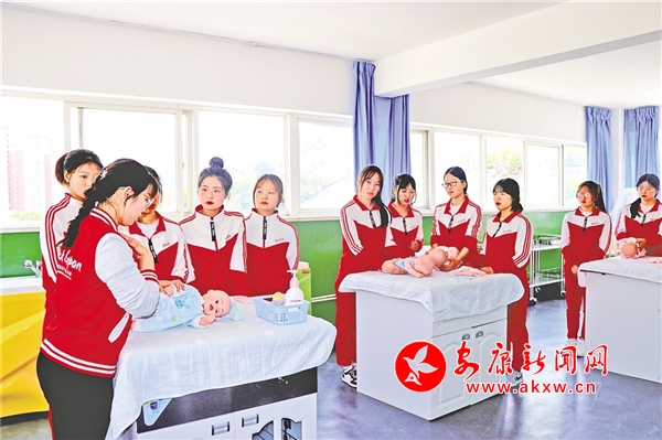 幼兒保育專業學生在課堂上展示幼兒護理技能。