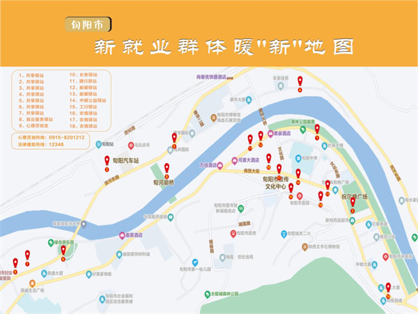 為提升服務效能,讓更多新就業群體享受到便捷的暖新服務,旬陽市委社會工作部特別制作了暖“新”地圖,將城區18處共享驛站具體位置精準標注在地圖上,可一目了然找到距離最近的驛站。此外,暖“新”地圖還提供了旬陽心理咨詢熱線和“12348”法律援助熱線,全方位服務新就業群體。