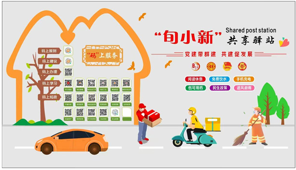 “旬小新”共享驛站按照“黨建帶群建 共建促發展”思路,秉持“需求前置、服務賦能”理念,通過整合行業部門、企業、社會三方資源,著力構建“15分鐘暖新服務生態圈”,為快遞員、外賣騎手等新就業群體提供閱讀休息、免費飲水、手機充電、應急藥箱等18項基礎服務設施。