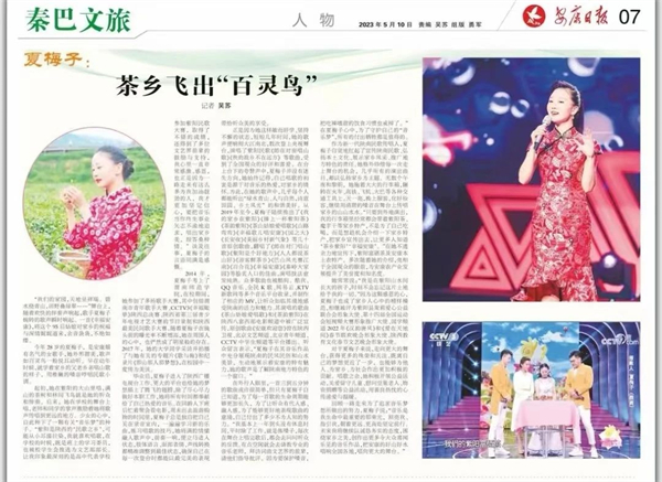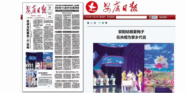 夏梅子曾登上央視宣傳過安康富硒茶,她在CCTV-3綜藝頻道《幸福賬單》欄目演唱陜南民歌并介紹了紫陽富硒茶(綠茶、紅茶)、紫陽金錢橘、紫陽魔芋干、紫陽硒陶等紫陽特產。在才藝展示環節,夏梅子演唱了由著名作家、書法家、中國作家協會會員、陜西省民間文藝家協會專家庫成員曾德強老師創作的《游客醉茶鄉》,她希望更多的人關注和支持家鄉,能夠愛上安康紫陽,愛上紫陽富硒茶。LGJ安康新聞網