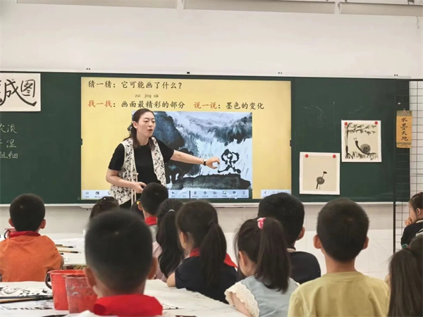活動中,鐘樓第二實驗小學副校長方文婷和常州經開區教學部主任楊婷老師分別呈現了一年級美術課程《葉子片片》和《練筆成圖》。兩位老師的課程內容充滿創新與深度。授課內容從印刷術與拓染法相結合,引導學生們探索美術與生活的緊密聯系,到通過手指操的引導,幫助孩子們在逐漸掌握水墨畫的基本坐姿和執筆方法中感受傳統文化魅力。