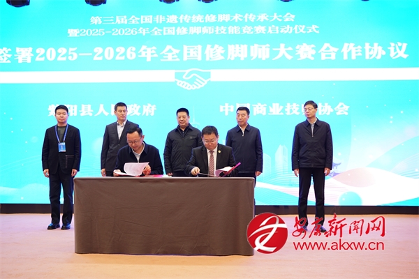 簽約與啟動儀式上,紫陽縣人民政府與中國商業技師協會簽署2025—2026年全國修腳師大賽合作協議,并共同啟動大賽。紫陽縣人社局與揚州市陸琴腳藝職業培訓學校簽訂修腳技能培訓協議;現場還舉行了會旗交接儀式,確定了下一屆承辦單位。