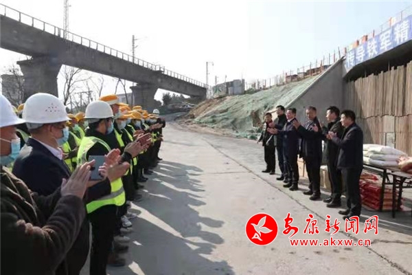 在北環(huán)線施工現(xiàn)場,高晶華指出,北環(huán)線建設(shè)是拉大城市骨架、提升通行順捷、疏解城市壓力的控制性工程。項(xiàng)目開工以來,大家心懷筑路夢,不畏艱與辛,主體工程推進(jìn)順利,市委、市政府和全市人民對(duì)你們表示敬重和感謝。希望大家搶抓時(shí)機(jī),排除困難,保障質(zhì)量,安全施工,確保如期建成通車。
