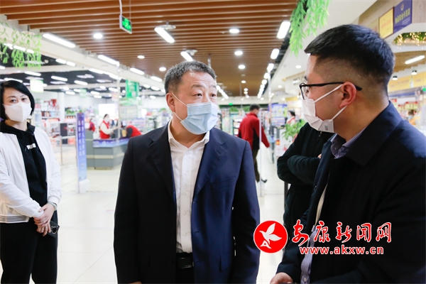 在天一城市廣場,武文罡實地查看疫情防控常態化措施落實情況,要求各類市場經營主體必須堅決克服麻痹思想,從嚴落實重點場所“測溫、驗碼、戴口罩、一米距、常消毒”常態化疫情防控措施,全力消除各類風險隱患。同時強調各級要加強物資調運,備足生活物品,穩定市場價格,確保滿足群眾生產生活需求。