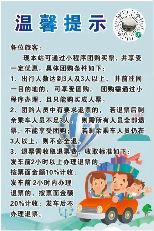 新增團購小程序,目前開啟安康——紫陽團購票,紫陽全程68公里,途經包茂高速,運行大約1小時。票價最低20元起,三人可成團,購票更優(yōu)惠!下方圖片內二維碼可快速購買。