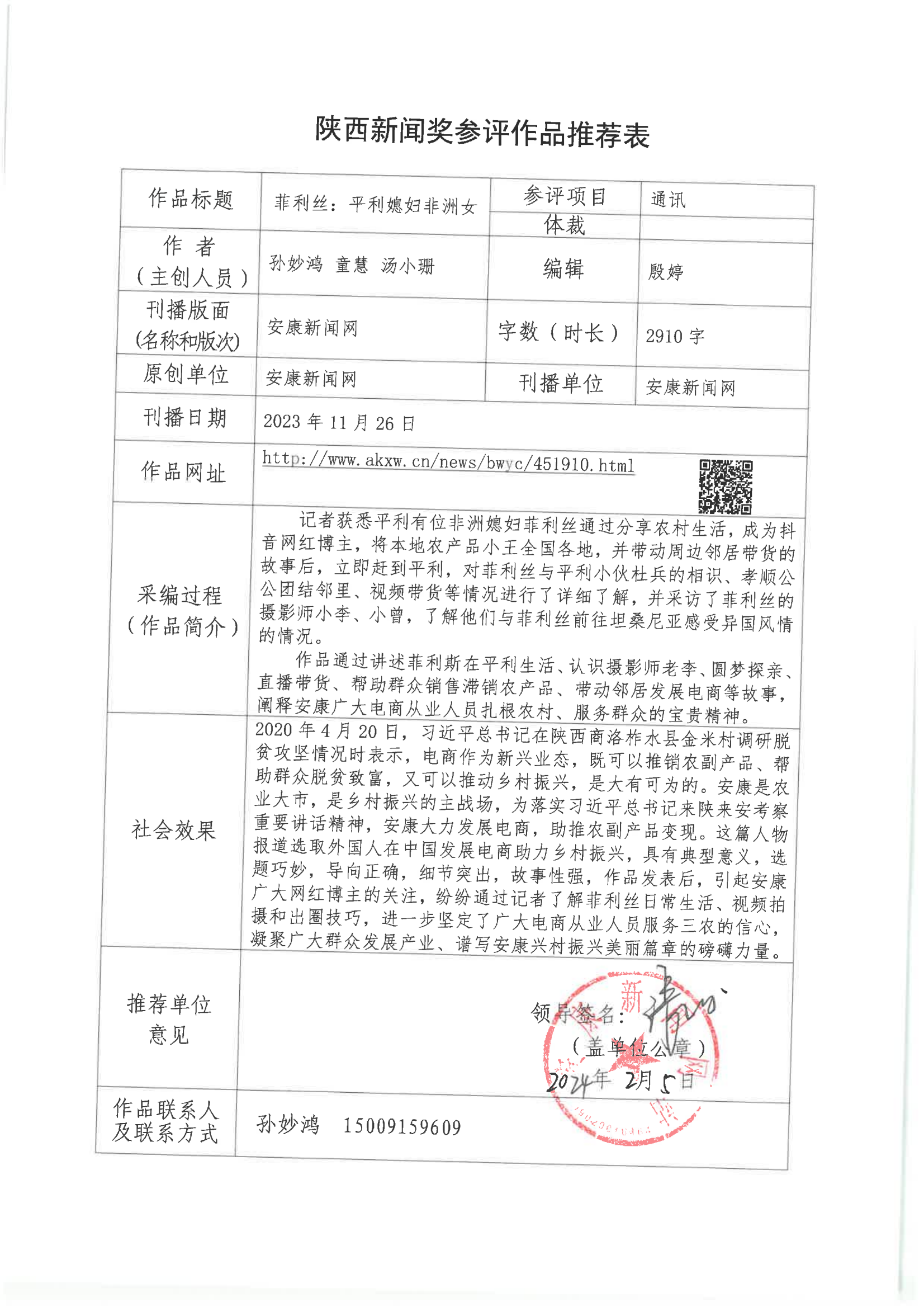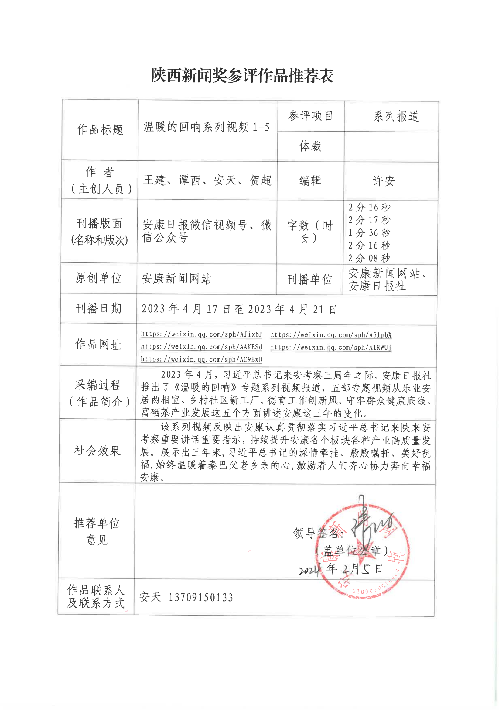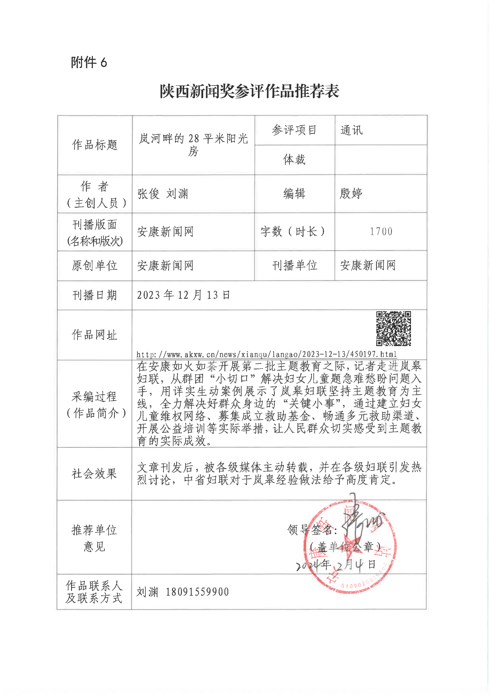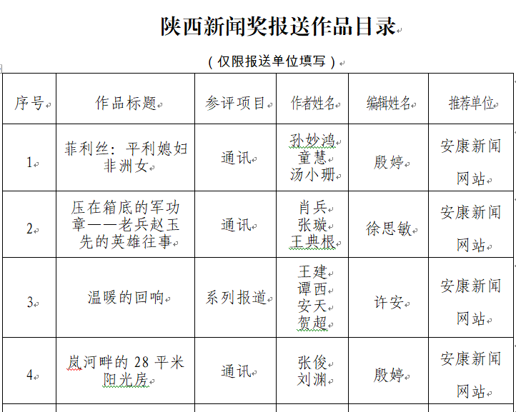 經過1月30日編委會推薦、社黨委研究決定,擬推薦以下4件新聞作品參評2023年度“陜西新聞獎”。公示時間從2024年3月6日至2024年3月12日,公示期為5個工作日。如有不同意見,請向安康日報社機關紀委、新聞管理部反映。RAj安康新聞網