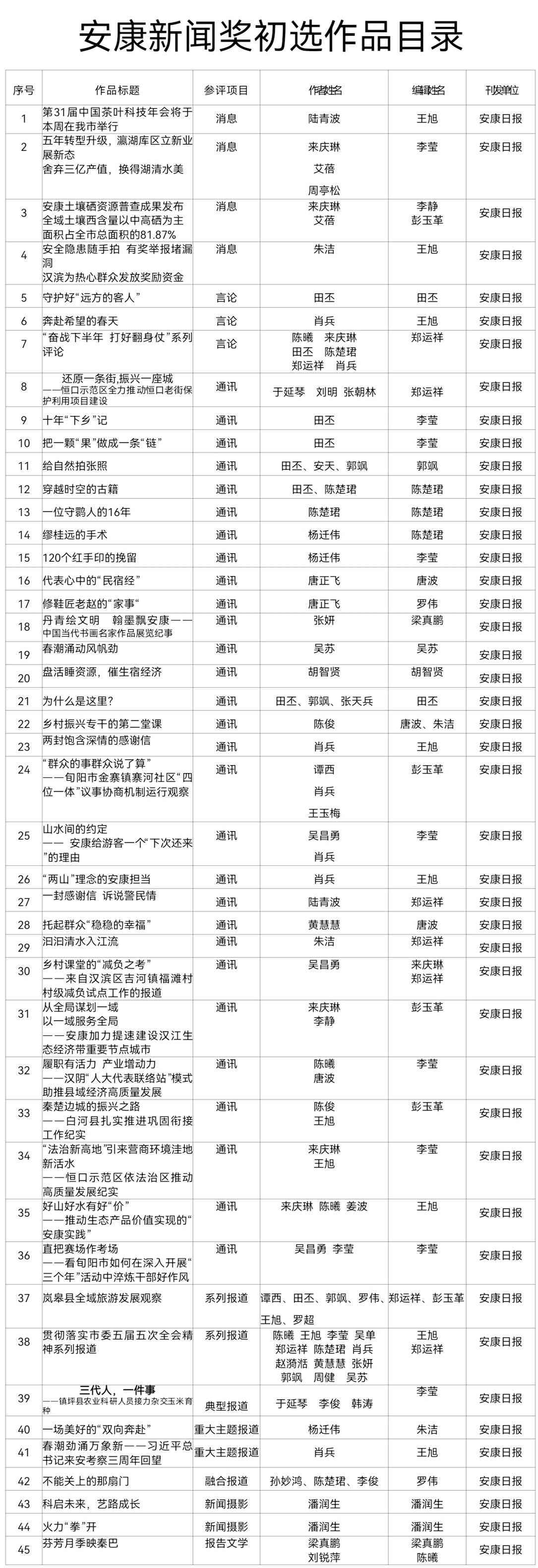 經(jīng)過3月20日編委會(huì)推薦、社黨委研究決定,擬推薦以下45件新聞作品參評2023年度“安康新聞獎(jiǎng)”。公示時(shí)間從2024年3月21日至2024年3月27日,公示期5個(gè)工作日。如有不同意見,請向安康日報(bào)社機(jī)關(guān)紀(jì)委、新聞管理部反映。waq安康新聞網(wǎng)