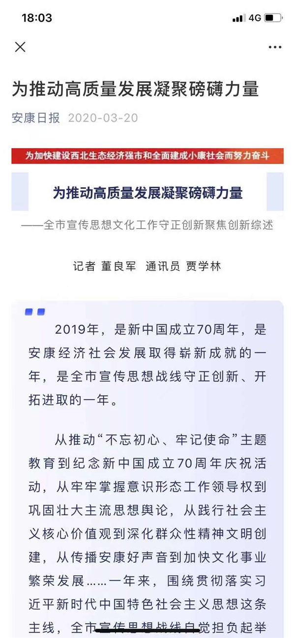 安康新聞網堅持以習近平新時代中國特色社會主義思想為指導,深入學習貫徹習近平總書記關于新聞輿論工作的重要論述和習近平總書記來陜來安考察重要講話、對陜西日報創刊80周年重要指示精神,增強“四個意識”,堅定“四個自信”,做到“兩個維護”,緊緊圍繞舉旗幟、聚民心、育新人、興文化、展形象的使命任務,不斷增強“四力”,弘揚正能量,傳播好聲音,為奮力譜寫安康新時代追趕超越新篇章營造良好的輿論氛圍。