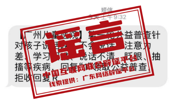 真相:近期,有社會醫療機構冒用廣州市婦女兒童醫療中心(以下簡稱“廣州婦兒中心”)名稱,通過群發短信的方式,宣傳該中心正在進行“身高普查”“針對孩子說話晚,不會說話、注意力差等”等公益普查項目。對此,廣州婦兒中心發布聲明稱,目前,該中心未就上述公益普查項目與其他任何醫療機構或社會組織存在合作關系,也未曾通過短信、電話向廣大患者推送過醫療信息。特此提醒廣大市民,切勿輕信此類信息,并注意保護個人隱私。(來源:廣東省互聯網舉報中心)