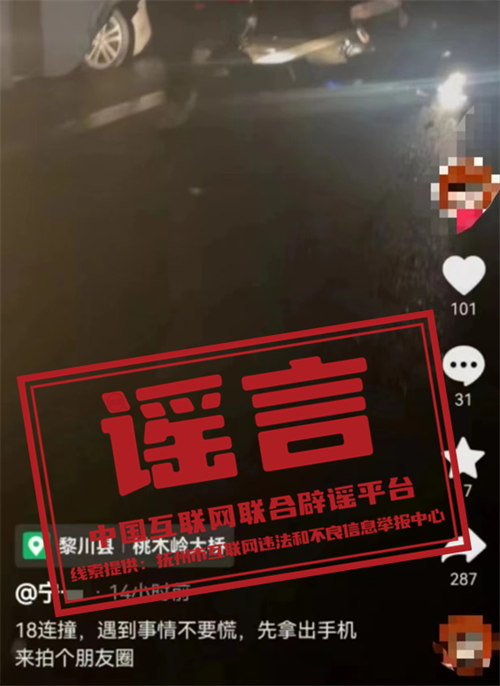 真相:近日,有網民在某網絡平臺發布“江西黎川境內福銀高速贛閩交界處發生一起18車連撞重大交通事故”的視頻。經向屬地高速交警核實,黎川高速路段并未發生18車連撞事故,該視頻信息系謠言。目前,警方已依法對散布網絡謠言視頻者予以行政處罰,并責令其刪除相關不實視頻。(來源:“撫州網警”微信公眾號)