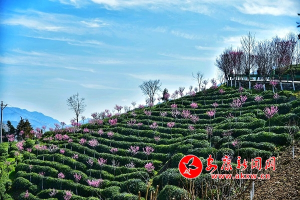 連日來,春光明媚的平利長安洪福茶山風景宜人,春梅、杏花競相開放。(攝影:王韜)
