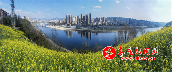 3月10日,安康城區安瀾樓西側江邊油菜花綻放,與碧水藍天相映成趣。(圖文/陳德模 羅德紅)