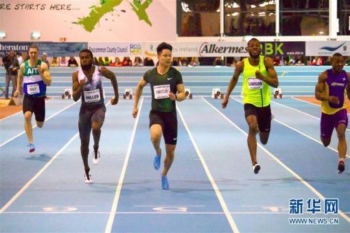 ↑2月13日,中國選手蘇炳添(中)在預賽中沖刺。 當日,在愛爾蘭阿斯隆舉行的室內大獎賽中,中國短跑名將蘇炳添以6秒52的成績在男子60米比賽中奪冠并打破賽會紀……