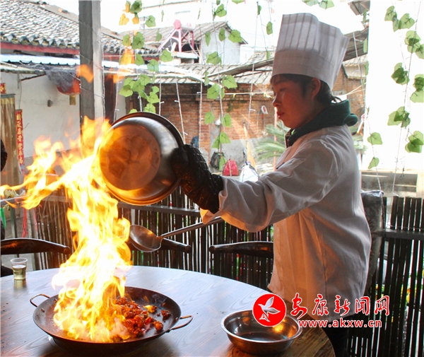 許苗苗是“好友之家”的三個(gè)合伙人之一,是個(gè)快人快語(yǔ)的女老板,她麻利地穿上白色大廚褂子,拿著一個(gè)從貴州定制的鐵鍋在手中掂了掂,迅速放在桌子上放油加熱,將預(yù)先準(zhǔn)備好的紅綠尖椒倒入鍋中翻炒,隨后將腌制好的雞塊伴著酒倒入鍋中,霎時(shí)間火苗竄出半米高,圍觀的客人們發(fā)出陣陣感嘆。等上幾秒火小了,許老板不慌不忙地用鏟子翻炒大致兩分鐘,香味撲鼻的鐵鍋雞便做好了。許苗苗介紹道:“貴州鐵鍋雞一雞三吃,將一只整雞剔骨,骨頭用來(lái)熬粥,帶少許骨頭的雞肉入鐵鍋進(jìn)行第一道加工食用,吃到一半的時(shí)候放入無(wú)骨雞肉上鍋燜煮十來(lái)分鐘,這樣才能將雞肉帶來(lái)的所有味覺(jué)體驗(yàn)發(fā)揮到淋漓盡致。”