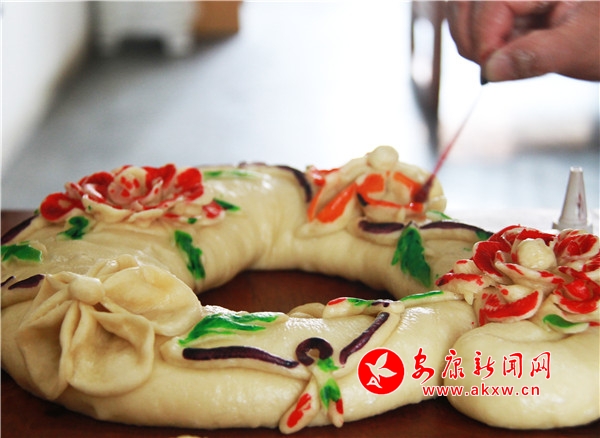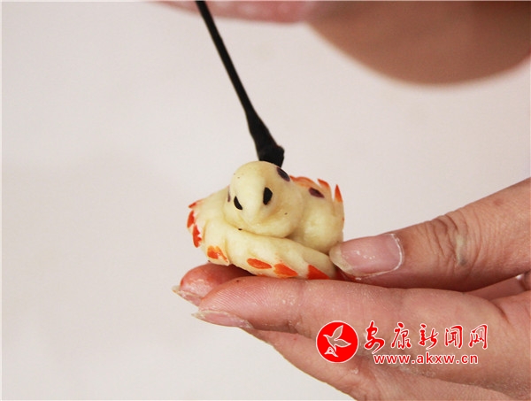 據(jù)了解,在安康本地常見的面塑有四種:第一種是生日滿月面塑,塑造成象征吉祥的植物、動(dòng)物及人物形象,如雙魚、項(xiàng)圈等寓意為健康、平安、一帆風(fēng)順等。第二種是祝壽面塑,多為壽糕、壽桃造型。以祝健康長壽之意。第三種是喪葬祭祀面塑,用椌、塑、串各種手法蒸制成動(dòng)、植物造型,如:龍、鳳、花鳥魚蟲等。施以紅黃綠重彩點(diǎn)染,稱為“供獻(xiàn)”,專用于亡靈的祭祀。第四種就是日常食用面塑,如油旋、麻花、點(diǎn)心、面角等。