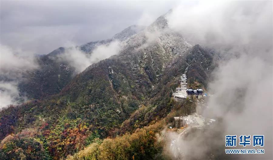 云霧中的鬼谷嶺國家森林公園山頂白雪皚皚,山腰秋色正濃(11月8日無人機(jī)拍攝)。 新華社記者陶明攝