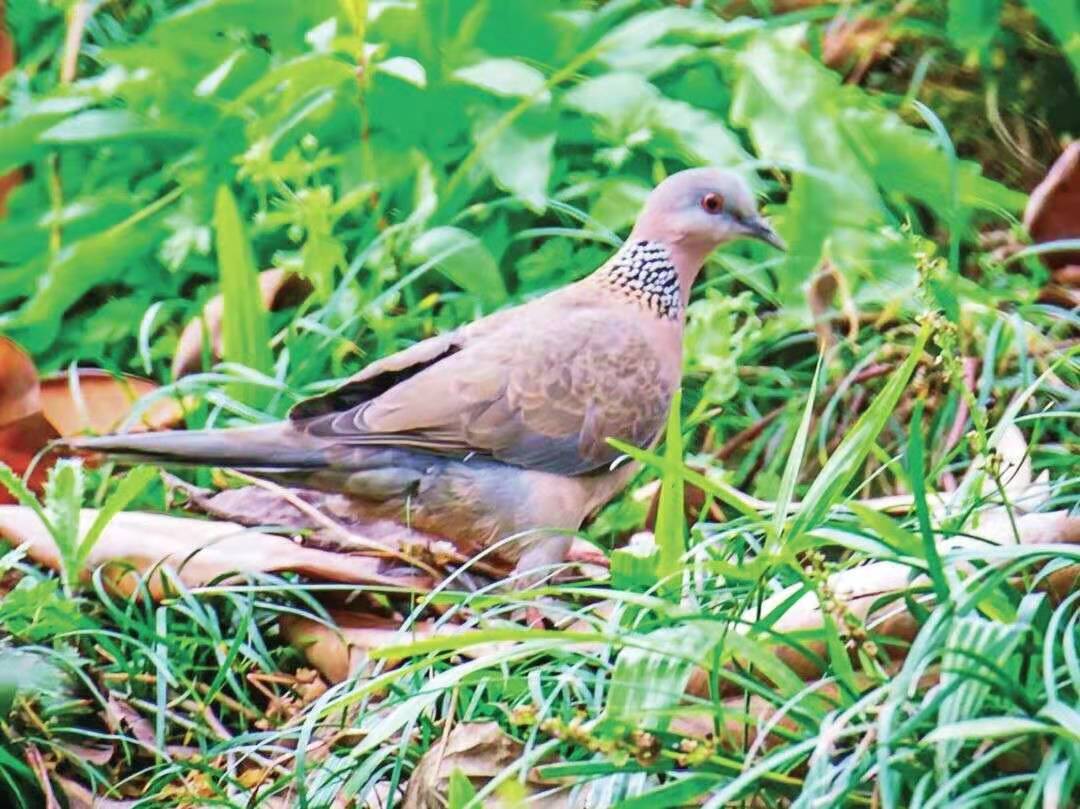 珠頸斑鳩也是很少到地面上來,只有無人時,會笨拙地飛到在地面上叨食。它們常藏在樹枝間,看不到身影,但會發出“咕咕”的聲音,表明自己的存在。