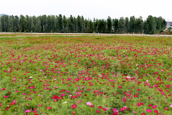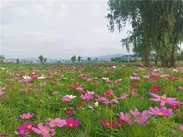 花卉種類:格桑花、千日紫、火焰雞冠花、萬壽菊、百日草、向日葵;還有月季玫瑰樹等。