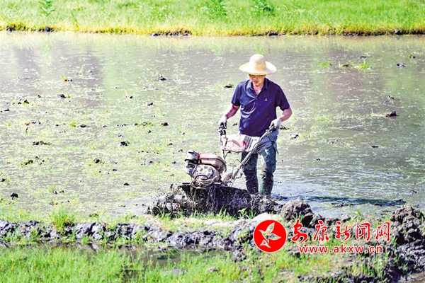 5月1日,石泉縣城關鎮(zhèn)絲銀壩村百畝水田里,農戶操作旋耕機做好插秧前的各項準備工作。董長松 攝