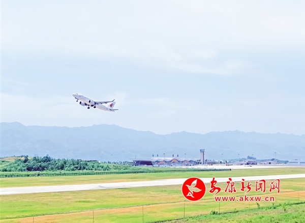 5月1日上午,一架客機離開安康富強機場。如今立體的交通網絡大大方便了安康人出行,同時也方便游客來安康旅游觀光。陳德模 攝