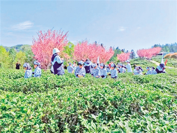 飯后陽光漫過茶壟的剎那,茶園正鋪展著千年的風(fēng)雅。我迫不及待換上采茶圍裙踏入皇茶園,體驗采茶、做茶的樂趣。指尖輕捻“一芽一葉”的嫩綠,在古法炭焙的鐵鍋里翻涌著時光的溫度,待山泉水與雀舌相遇時,茶香便化作裊裊云煙,在青瓷盞中演繹生命的涅槃。